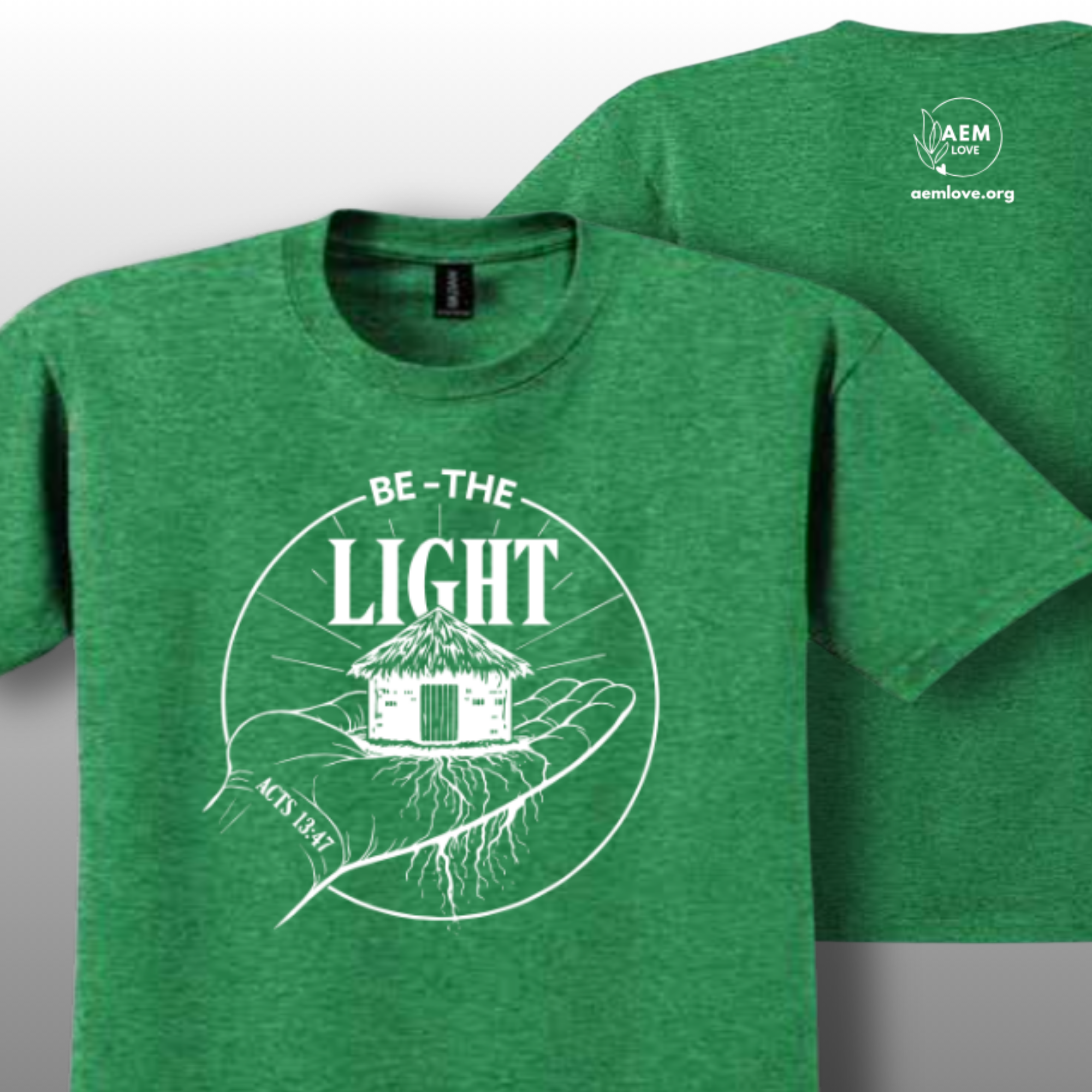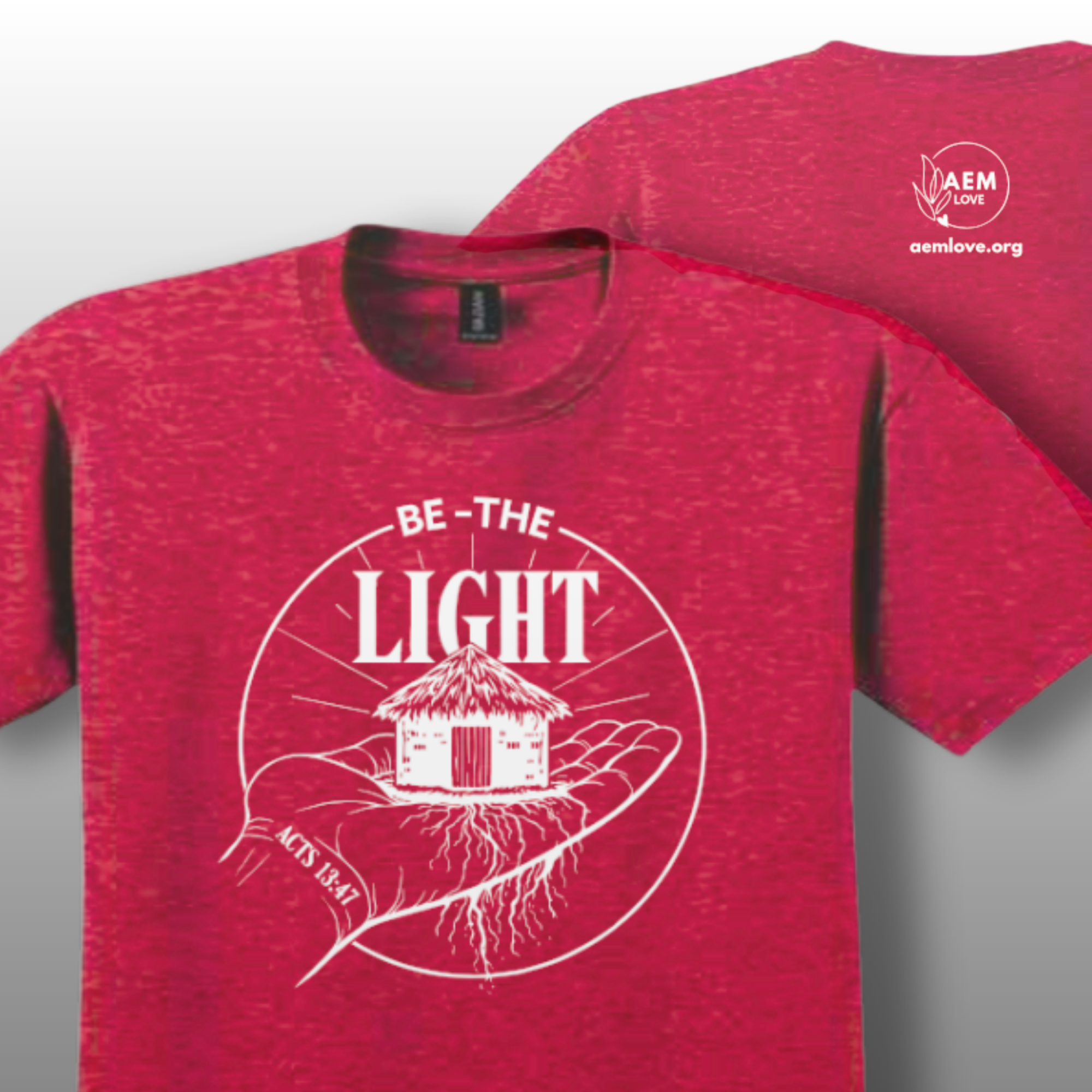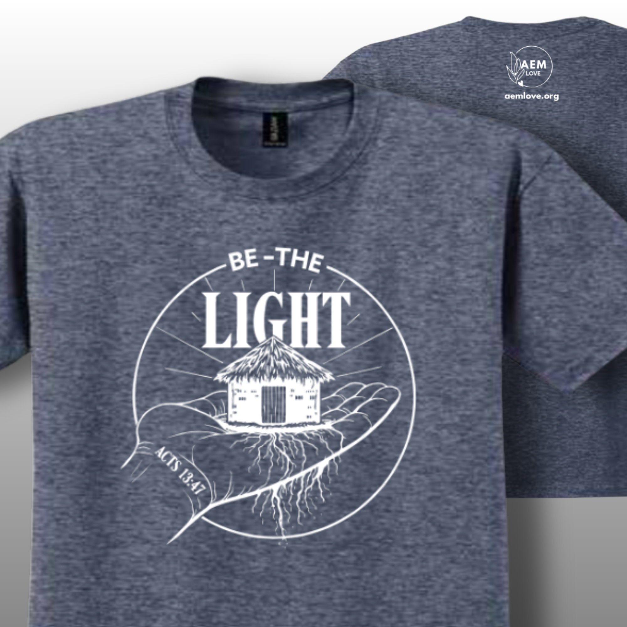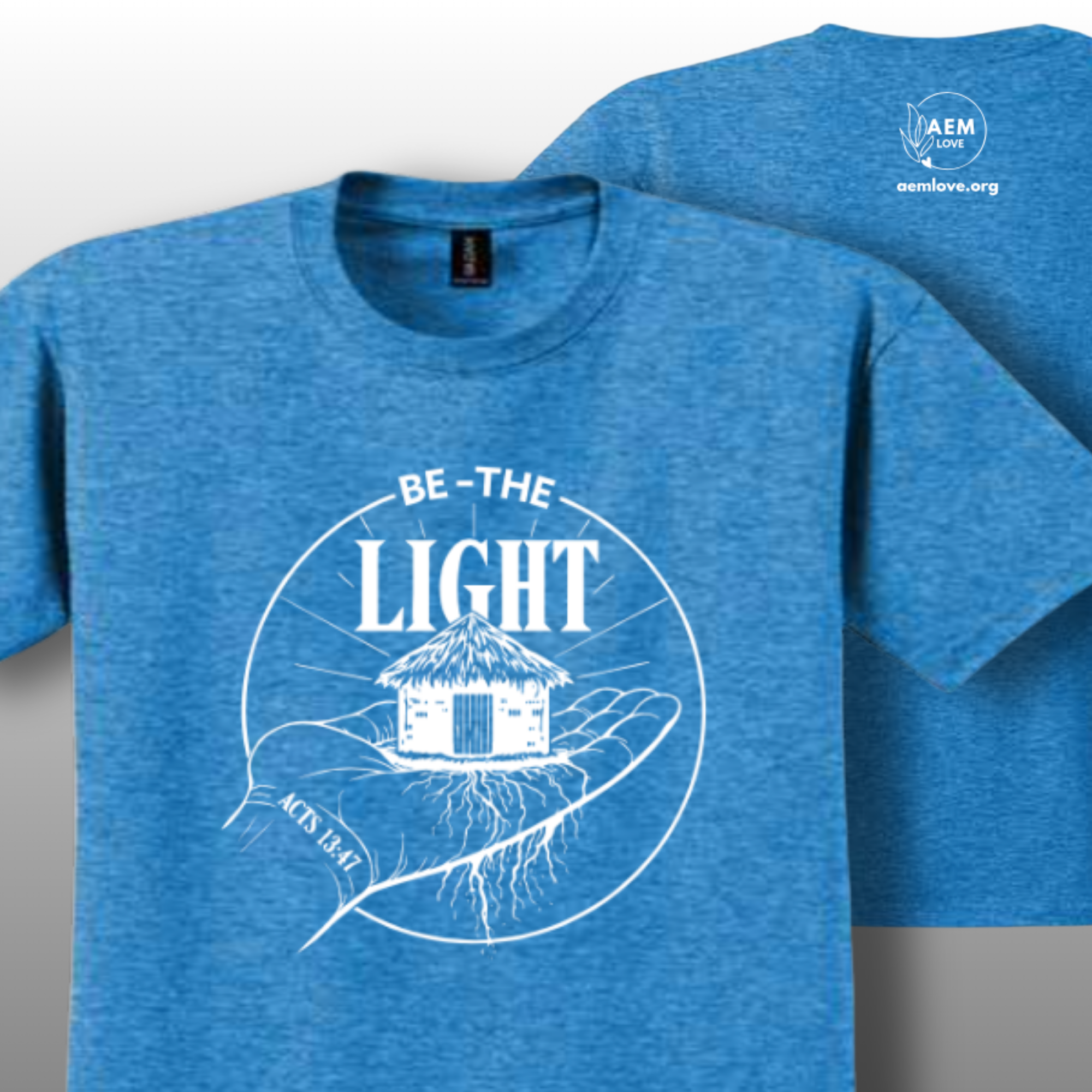 Pre-order now. Our mission trip shirts are back with a new team member drawn design. This first order will ship by April 2nd. Each shirt has the Be The Light design on the front and a small AEM Love logo between the shoulder blades on the back.